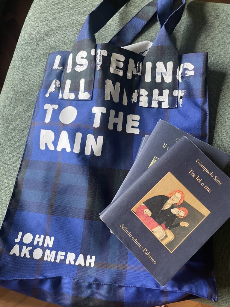 (La shopper è una delle mie preferite, anche per la frase che continuavo a rileggere nei giorni di caldo, e perché mi piace tanto la pioggia sul tetto: Listening All Night To The Rain. Era il padiglione UK dell’artista John Akomfrah, alla Biennale di Venezia del 2024).