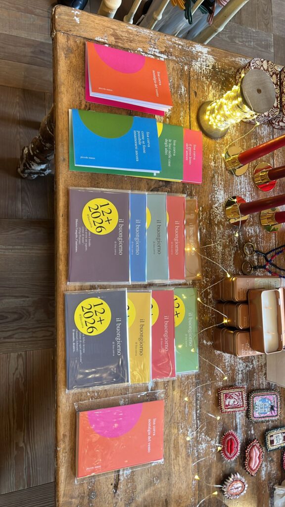 E i Buongiorno, che abbiamo finalmente stampato in formato cartolina: una confezione da 12, che abbiamo chiamato “Un anno insieme a noi”. Da spedire, regalare, usare come segnalibro, mettere sulla scrivania…